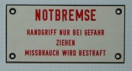 Aufschrift: NOTBREMSE | HANDGRIFF NUR BEI GEFAHR | ZIEHEN | MISSBRAUCH WIRD BESTRAFT
