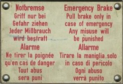Aufschrift: Notbremse | Griff nur bei | Gefahr ziehen | Jeder Mißbrauch | wird bestraft (zus. franz., engl. und ital.)