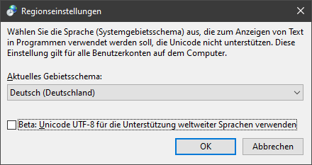 Lösung: In Ihrem Windows 10 oder 11 ist vermutlich UTF-8 für die Verwendung weltweiter Sprachen