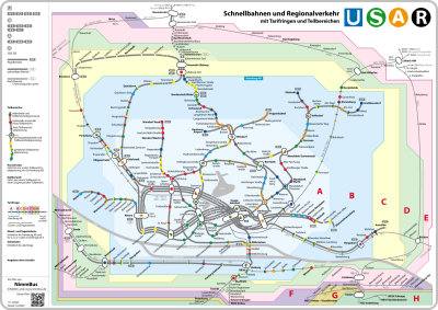 Netzplan Schnellbahnen und Regionalverkehr mit Tarifringen und Teilbereichen